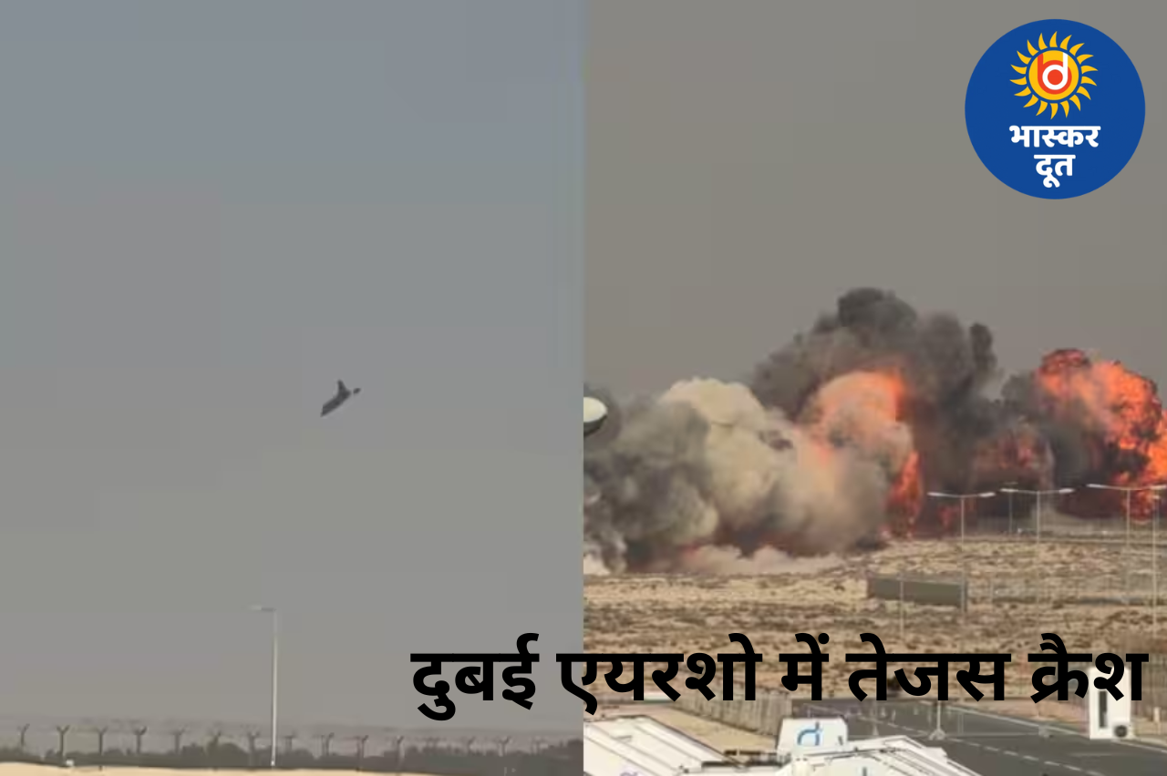दुबई एयरशो के दौरान भारत के हल्के लड़ाकू विमान तेजस के साथ बड़ा हादसा हो गया। हाई-स्पीड एयर शो डेमो के दौरान विमान अचानक नियंत्रण खोकर जमीन पर गिर गया और टकराते ही भीषण आग लग गई। हादसे का दर्दनाक वीडियो सामने आया है, जिसमें तेजस को तेजी से नीचे गिरते और बाद में काला धुआं उठते देखा जा सकता है।