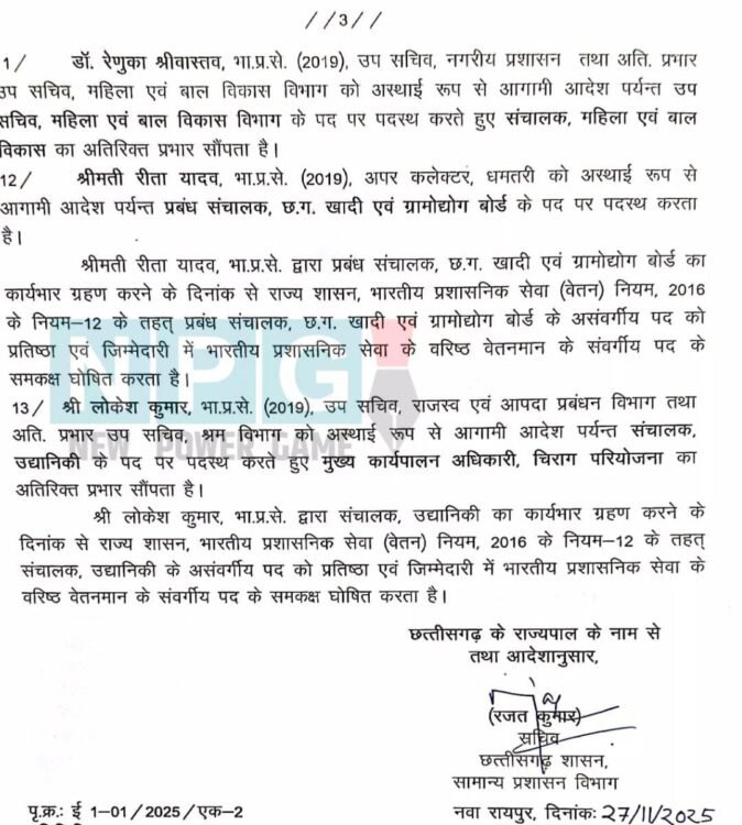 आईएएस रितेश कुमार अग्रवाल, प्रबंध संचालक छग मेडिकल सर्विसेस कार्पोरेशन रायपुर को उनके वर्तमान कर्तव्यों के साथ-साथ आयुक्त, चिकित्सा शिक्षा का अति. प्रभार सौंपा गया है। आईएएस इफ्फत आरा, अपर संभागीय आयुक्त, रायपुर संभाग, रायपुर तथा अति. प्रभार अपर संभागीय आयुक्त, दुर्ग संभाग दुर्ग को अस्थाई रूप से आगामी आदेश पर्यन्त विशेष सचिव, राजस्व एवं आपदा प्रबंधन विभाग के पद पर पदस्थ करते हुए प्रबंध संचालक, नागरिक आपूर्ति निगम का अतिरिक्त प्रभार सौंपा गया है।