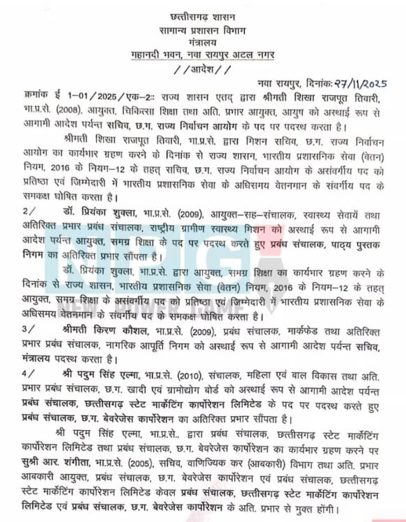 आईएएस शिखा राजपूत तिवारी, आयुक्त चिकित्सा शिक्षा एवं अति. प्रभार आयुक्त आयुष को अस्थायी रूप से आगामी आदेश पर्यन्त सचिव, छग राज्य निर्वाचन आयोग के पद पर पदस्थ किया गया है। आईएएस डॉ. प्रियंका शुक्ला, आयुक्त-सह-संचालक, स्वास्थ्य सेवायें तथा अतिरिक्त प्रभार प्रबंध संचालक, राष्ट्रीय ग्रामीण स्वास्थ्य मिशन को अस्थायी रूप से आगामी आदेश पर्यंत आयुक्त, समग्र शिक्षा के पद पर पदस्थ करते हुए प्रबंध संचालक, पाठ्य पुस्तक निगम का अतिरिक्त प्रभार सौंपा गया है।