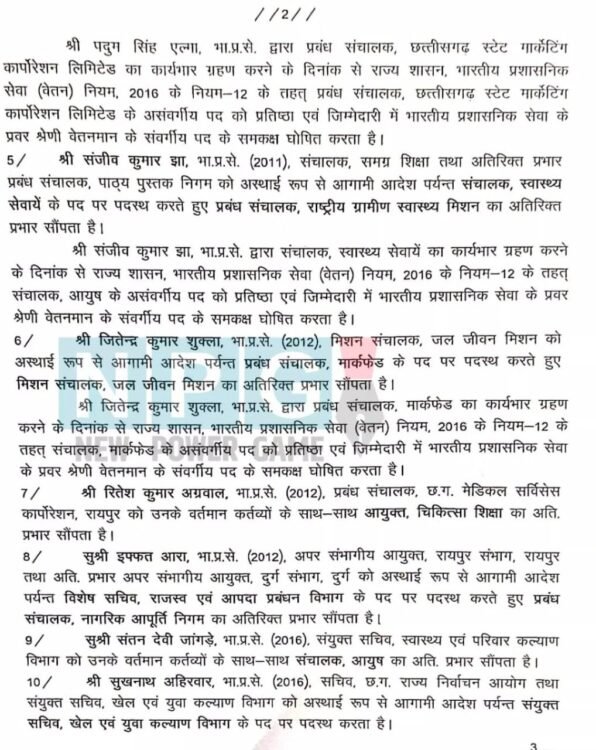 आईएएस संतन देवी जांगड़े, संयुक्त सचिव, स्वास्थ्य एवं परिवार कल्याण विभाग को उनके वर्तमान कर्तव्यों के साथ-साथ संचालक, आयुष का अति. प्रभार सौंपा गया है। आईएएस सुखनाथ अहिरवार, सचिव छग राज्य निर्वाचन आयोग तथा संयुक्त सचिव, खेल एवं युवा कल्याण विभाग को अस्थाई रूप से आगामी आदेश पर्यन्त संयुक्त सचिव, खेल एवं युवा कल्याण विभाग के पद पर पदस्थ किया गया है।