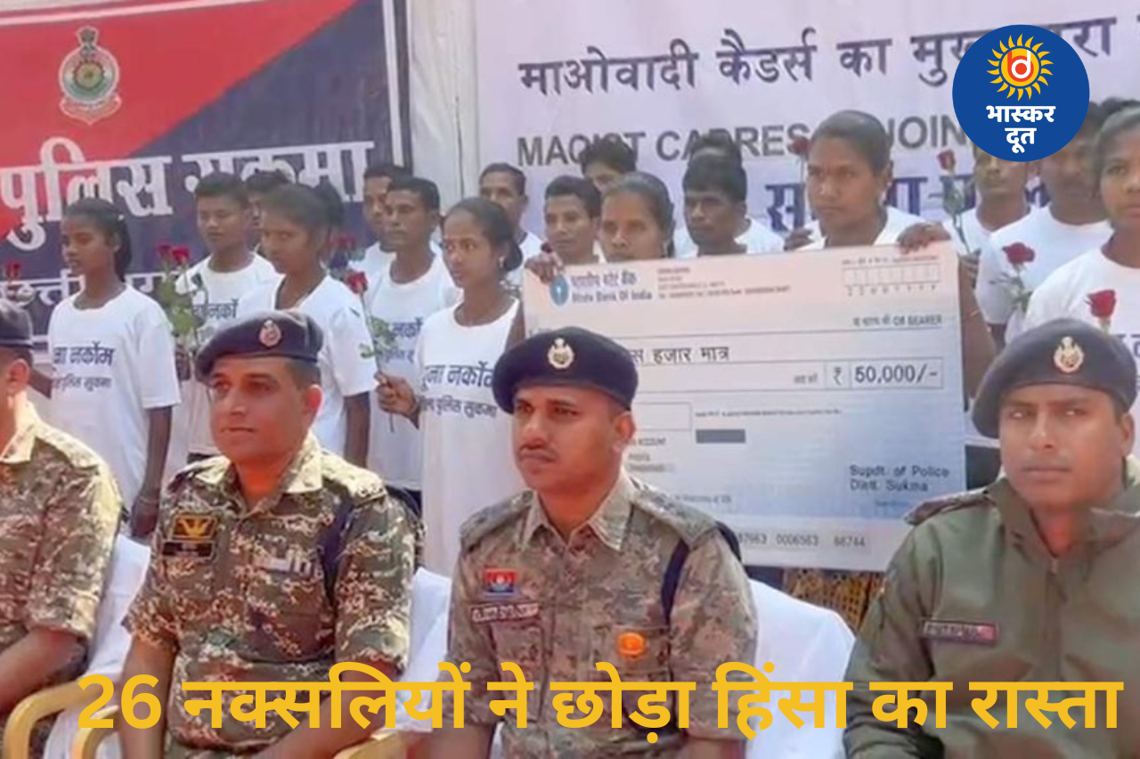 छत्तीसगढ़ के नक्सल प्रभावित सुकमा जिले में चल रहे ‘पूना मार्गेम’ (पुनर्वास से पुनर्जीवन) अभियान को बड़ी सफलता मिली है। इस पहल से प्रभावित होकर 7 महिला कैडर समेत कुल 26 माओवादियों ने सुरक्षा बलों के समक्ष आत्मसमर्पण किया है। इन नक्सलियों पर कुल 64 लाख रुपये का इनाम घोषित था, जिससे माओवादी संगठन को बड़ा झटका माना जा रहा है।