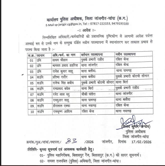 जांजगीर-चांपा। जिले में पुलिसिंग में कसावट लाने के लिए बदलाव किया गया है। एसपी विजय पांडेय ने प्रशासनिक दृष्टिकोण से आगामी आदेश तक के लिए 10 पुलिस कर्मियों का तबादला आदेश जारी किया है।