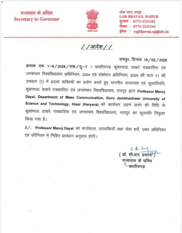 जारी आदेश में उल्लेखित है कि छत्तीसगढ़ कुशाभाऊ ठाकरे पत्रकारिता एवं जनसंचार विश्वविद्यालय अधिनियम, 2004 एवं संशोधन अधिनियम 2025 की धारा 11 की उपधारा (1) में प्रदत्त शक्तियों का प्रयोग करते हुए राज्यपाल एवं कुलाधिपति, कुशाभाऊ ठाकरे पत्रकारिता एवं जनसंचार विश्वविद्यालय, रायपुर द्वारा Professor Manoj Dayal, Department of Mass Communication, Guru Jambheshwar University of Science and Technology, Hisar (Haryana) को कार्यभार ग्रहण करने की तिथि से कुशाभाऊ ठाकरे पत्रकारिता एवं जनसंचार विश्वविद्यालय रायपुर का कुलपति नियुक्त किया गया है।