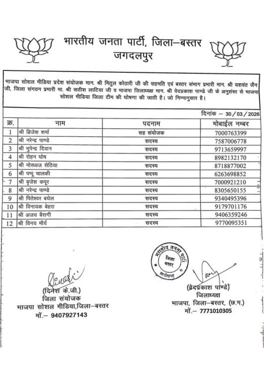 जगदलपुर। बस्तर जिले में राजनीतिक दलों ने संगठन को मजबूत करने की दिशा में कदम तेज कर दिए हैं। भाजपा और कांग्रेस ने जिला स्तर पर अपनी सोशल मीडिया टीम का गठन कर नई जिम्मेदारियां सौंपी हैं।