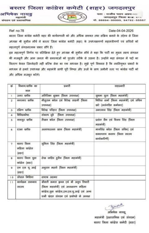 इसके साथ ही कांग्रेस ने जगदलपुर विधानसभा के अंतर्गत आने वाले सभी ब्लॉकों में प्रभारी और सह-प्रभारियों की नियुक्ति की है।