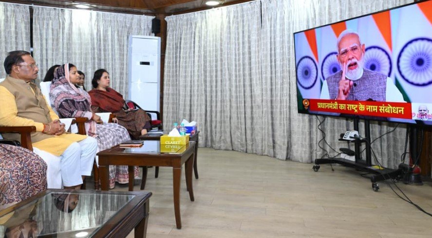 मुख्यमंत्री श्री विष्णुदेव साय ने आज राजधानी रायपुर स्थित मुख्यमंत्री निवास में प्रधानमंत्री श्री नरेंद्र मोदी के नारी शक्ति वंदन अधिनियम के सम्बन्ध में राष्ट्र के नाम प्रसारित संबोधन का श्रवण किया